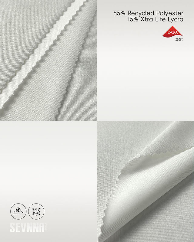 Με σύνθεση 85% ανακυκλωμένου πολυεστέρα και 15% Xtra Life Lycra, αυτά τα υφάσματα lycra από ελαστικό νήμα δεν είναι μόνο φιλικά προς το περιβάλλον αλλά και μακράς διαρκείας. Το ύφασμα είναι γνωστό για την ικανότητά του να διατηρεί το σχήμα και το χρώμα του ακόμη και μετά από πολλαπλά πλυσίματα, καθιστώντας το μια αξιόπιστη επιλογή για τους σχεδιαστές αθλητικών ρούχων.